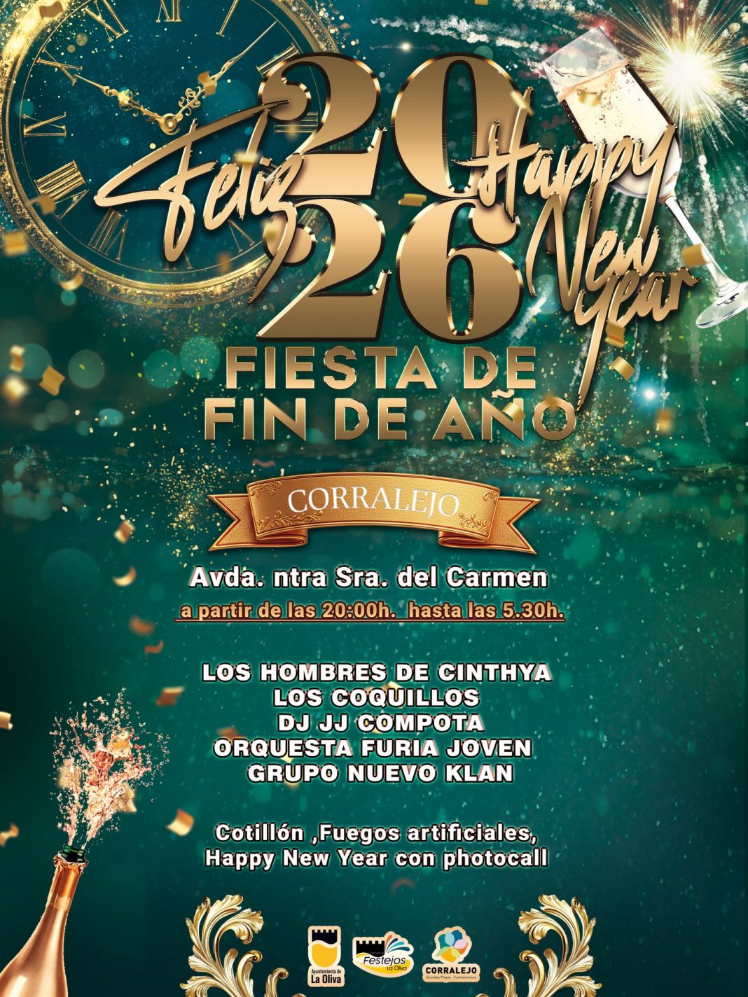 Die Fiesta de Fin de Año in Corralejo startet abends auf der Avenida Nuestra Señora del Carmen um 20 Uhr und läuft bis 05:30 Uhr. Besucher können sich auf eine Vielzahl von Künstlern freuen, darunter die beliebten Los Hombres de Cinthya und DJ JJ Compota, die für musikalische Unterhaltung sorgen. Auch ein beeindruckendes Feuerwerk wird den Himmel erleuchten, während ein Happy-New-Year-Photocall für unvergessliche Erinnerungen sorgt. Der Veranstalter, Ayuntamiento de La Oliva, sorgt für eine reibungslose Durchführung der Feierlichkeiten. Die Veranstaltung zieht zahlreiche Besucher an, die gemeinsam das neue Jahr willkommen heißen möchten.