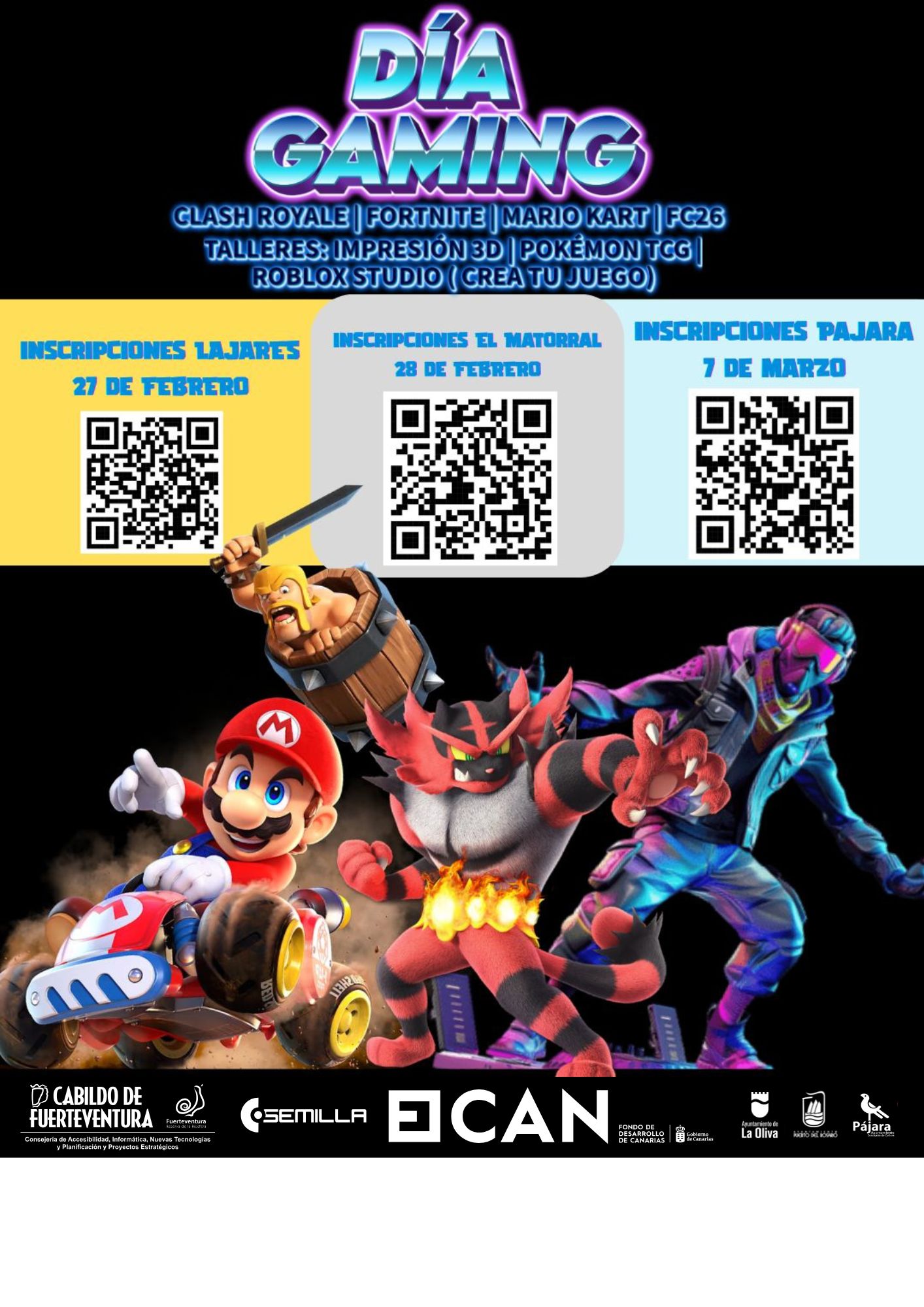 Der offizielle Start erfolgt mit den „Día Gaming“-Veranstaltungen, bei denen Familien und junge Gaming-Enthusiasten eingeladen sind, gemeinsam in spannenden Wettkämpfen wie Clash Royale, Pokémon TCG und FC24 anzutreten. Die Veranstaltungen finden im Kulturzentrum Lajares, El Matorral und in der Casa de la Juventud Morro Jable statt. Die Gaming-Tage bieten neben den Videospielwettbewerben auch Workshops zur Erstellung eigener Spiele und 3D-Druck an, was den Teilnehmern neue kreative Möglichkeiten eröffnet. Diese Veranstaltungen sollen die Gemeinschaft stärken und die Begeisterung für Gaming fördern, indem sie neue Horizonte eröffnen und die Zusammenarbeit unter den Teilnehmern fördern.