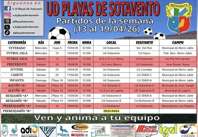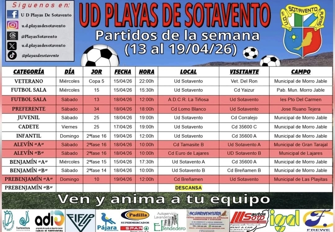 – Am Samstag, den 18. April 2026, gibt es mehrere Spiele, darunter um 12:00 Uhr A.D.C.R. La Tiñosa gegen Ud Sotavento im Ies Pto Del Carmen.